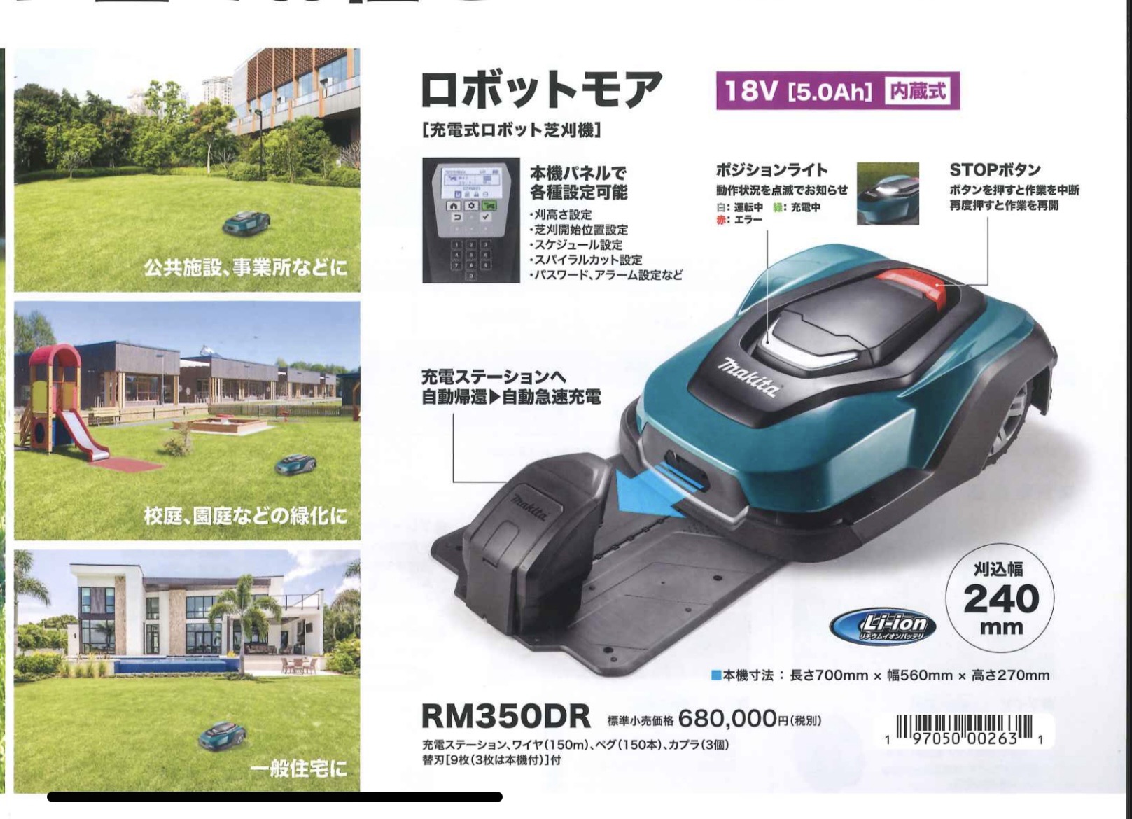 充電ステーション・ワイヤ(150m)・ペグ(150本)・コネクタ(5個)・カプラ(3個)・替刃9枚(3枚は本機付)・ACアダプタ・キャブタイヤコード・スクリュペグ(8本ステーション固定用)・六角棒スパナ価 格 ¥748,000(税込)応相談(設置についてのアドバイス、設置工事承ります。)
